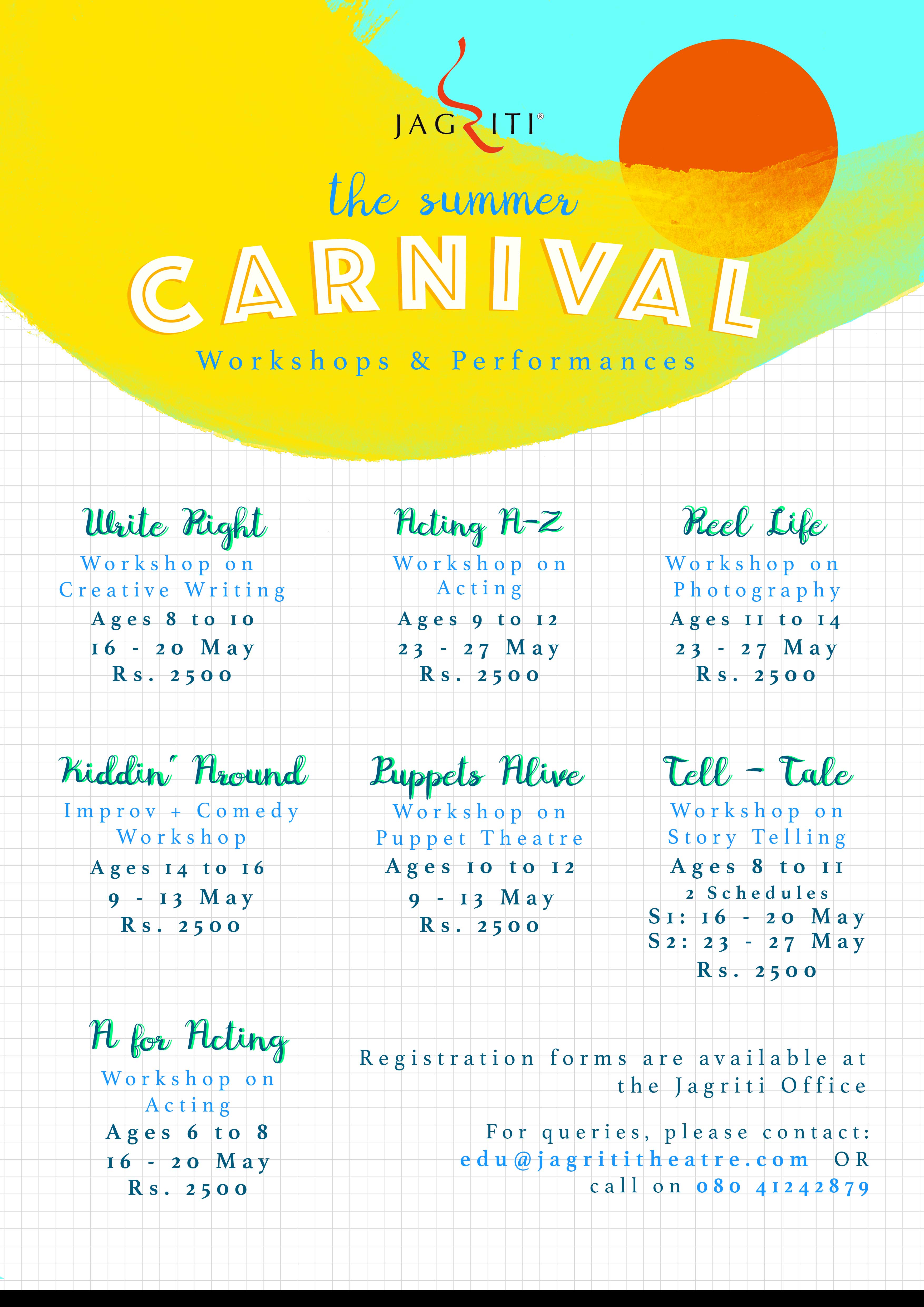 Media News Articles Jagriti Kids Carnival 2016 back Jagriti Kids Carnival 2016 Facebook Twitter Google+ Pinterest Details Ticket Price: ₹ 2500/-Genre:Children Event Date & Time Mon-09-May | 11:00 AM Click on the above image for details of the various workshops