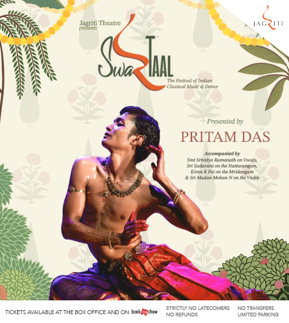 Pritam Das will be accompanied by Smt Srividya Ramanath on Vocals, Sri Sudarsini on the Nattuvangam, Kiran R Pai on the Mridangam, Sri Madan Mohan N on the Violin.